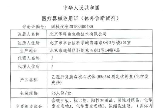 获得乙肝5项化学发光注册证;